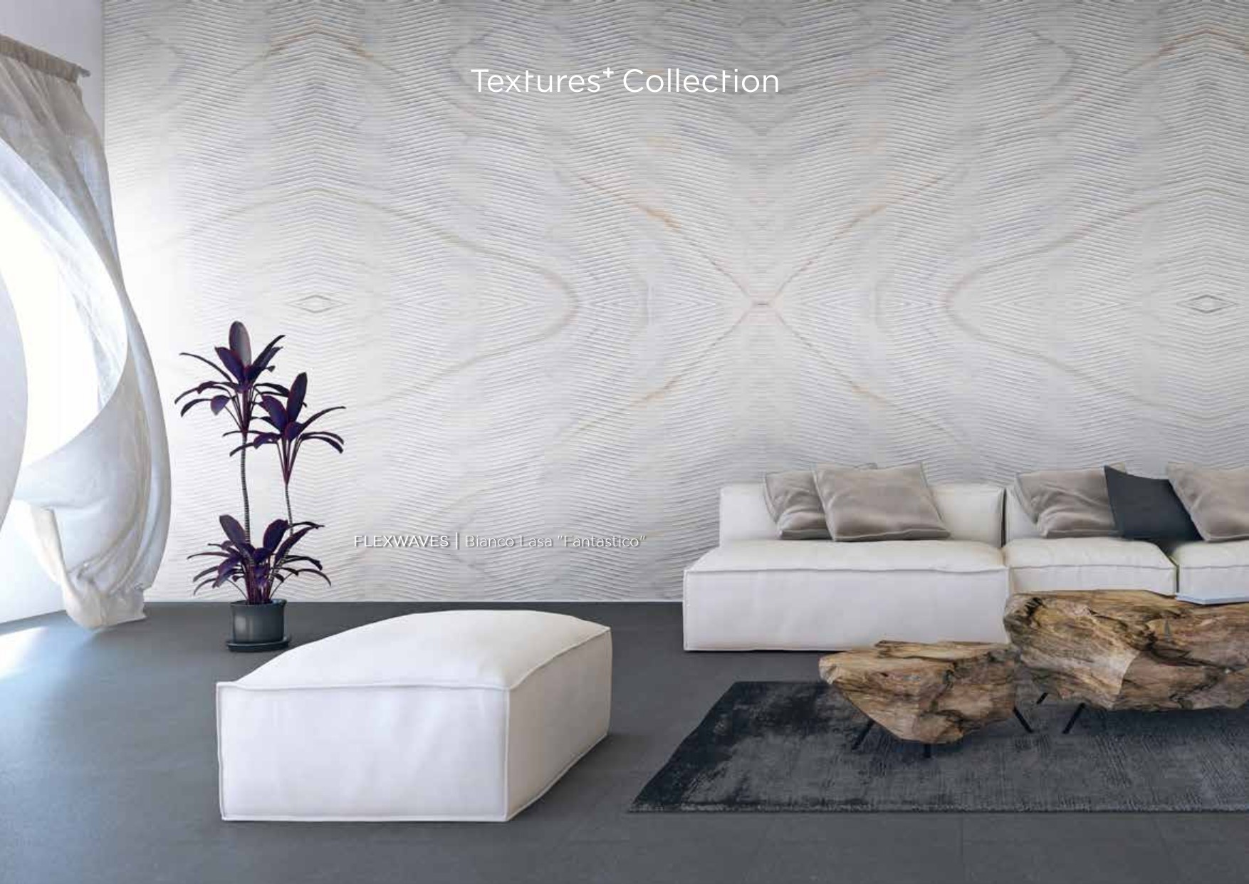 Kollektsioon pakub uudseid lahendusi seintele ja põrandatele, toimides paindliku tööriistana erinevate stiilide loomisel. Textures+ ühendab skulpturaalse pinnatöötluse ja kivimaterjali loomulikud omadused, pakkudes ühtaegu visuaalset ja taktiilset elamust. Traditsioonilisest tasapinnalisest kiviplaadist on saanud materjal, millega saab mängida valguse ja varjuga, luues unikaalseid ja väljendusrikkaid disainilahendusi.