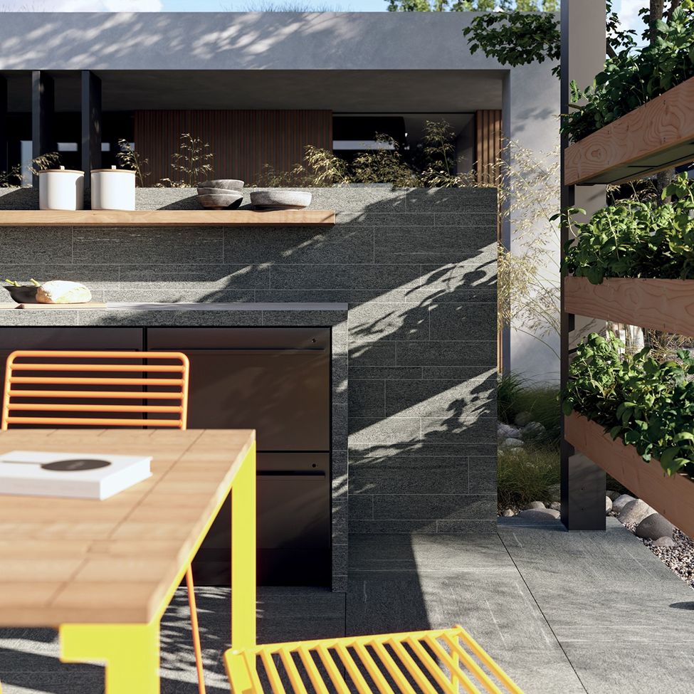 Siinne maja laiendati projekteerimise käigus terrassi võrra, kus maja sisearhitektuur ka mõtteliselt jätkub. Terrassil kasutati sama laadi keraamilisi plaate mis seeski. Ka köögisaar kaeti samade plaatidega. Elegantse vormi ja mugavuse kõrval on määraval kohal teostuse kvaliteet ja materjal. Et kogu see loodud ilu Eestimaa vihmase ilmaga ka järgmise suve vastu peaks, on oluline kasutada vastupidavaid ja veekindlaid materjale. Plaatidega kaetud köögisaar on praktiline, väga tugev, kriimustus-, määrdumis- ja kuumuskindel ning kõrge UV-vastupidavusega ja võib julgelt üle talve väljas seista. Need plaadid on väga tugevad ja vastupidavad, kannatavad vihma, ei pleegi päikese käes, on vastupidavad temperatuurimuutustele ja hülgavad mustust. Kui põhjalikum korrastustöö ette võtta, piisab veest ja survevoolikust.
